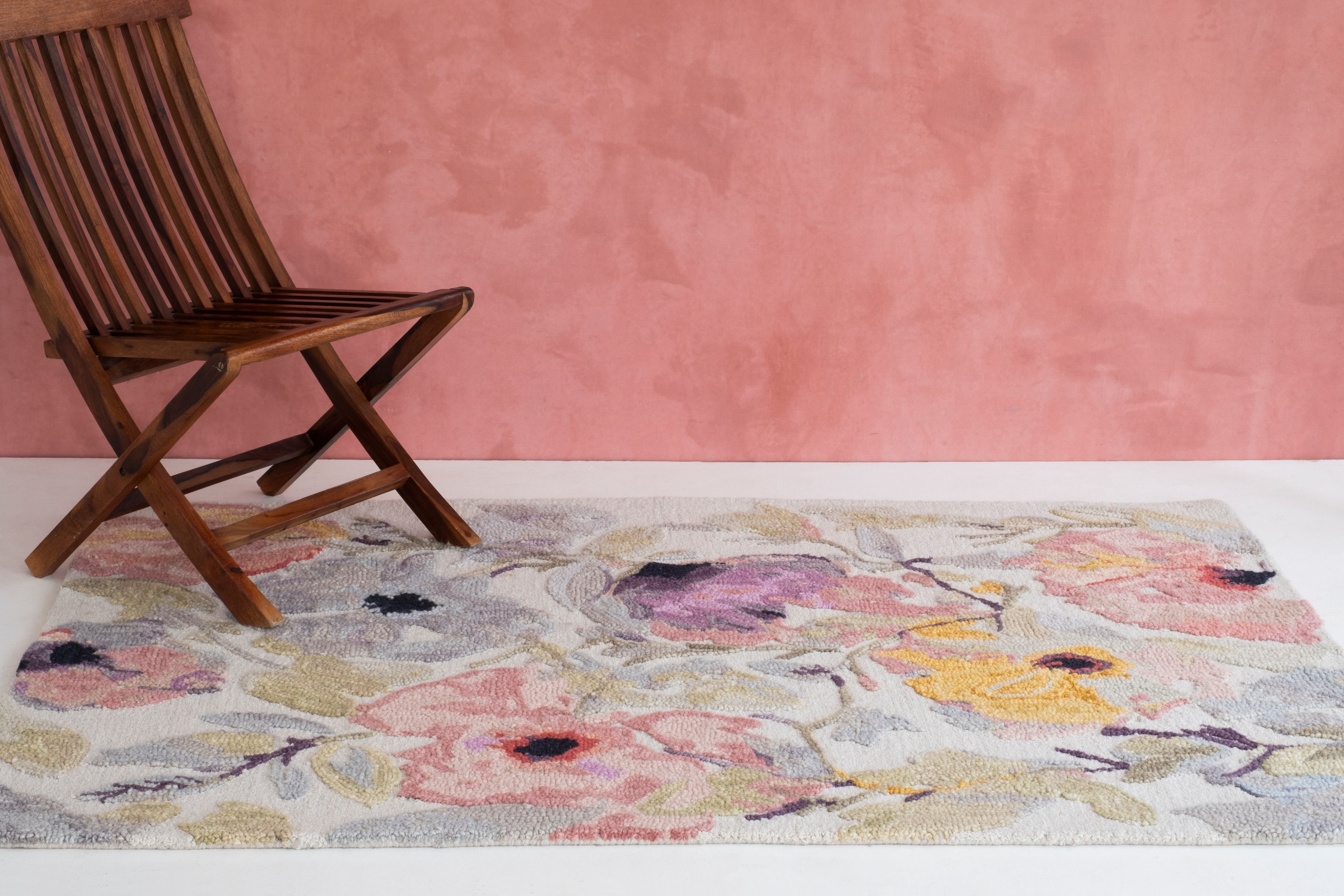 Combining premium textures with unparalleled craftsmanship, our hand-tufted carpets offer a blend of style and substance. Adorned with delicate pink and grey florals, 'Cambert' brings elegance and comfort to any space.