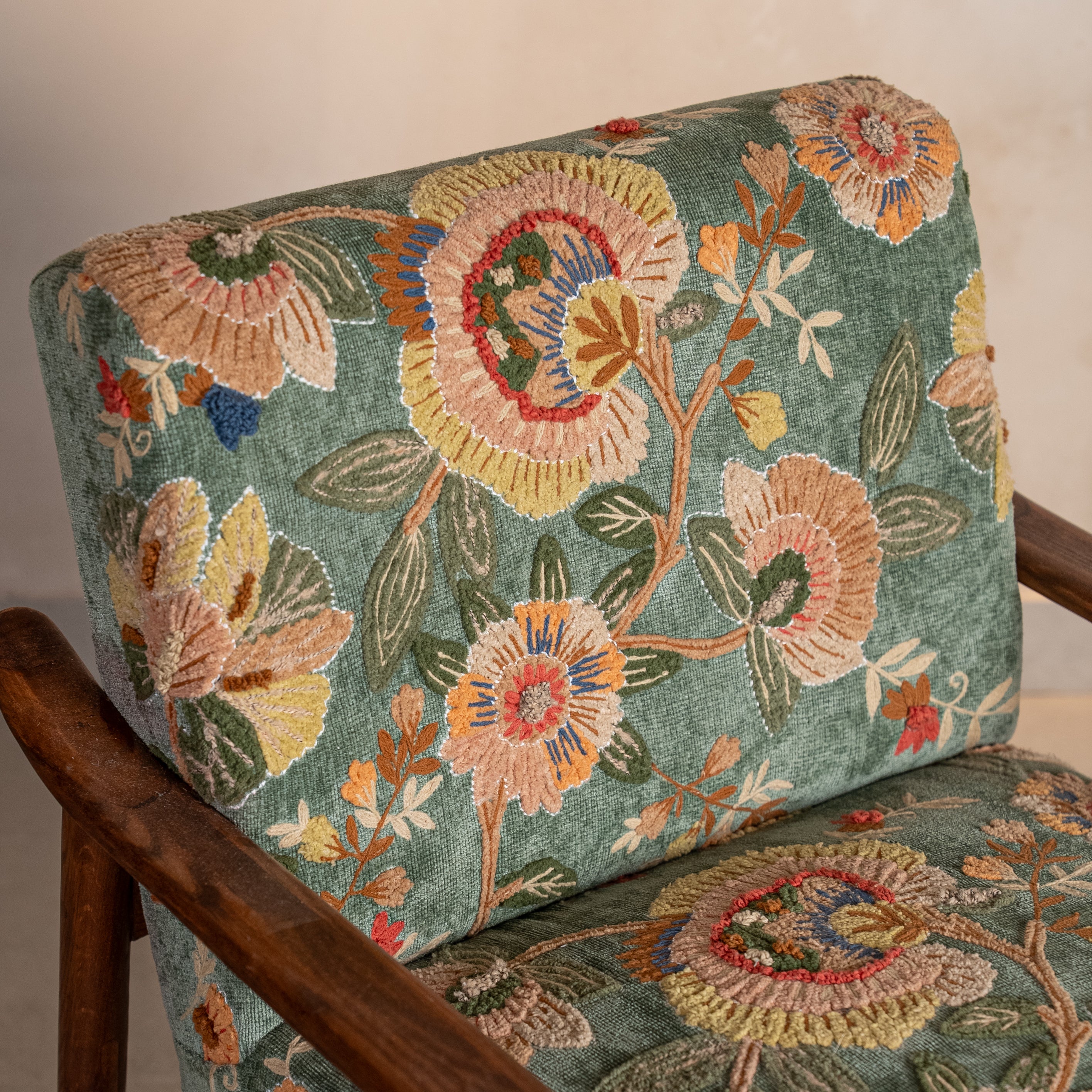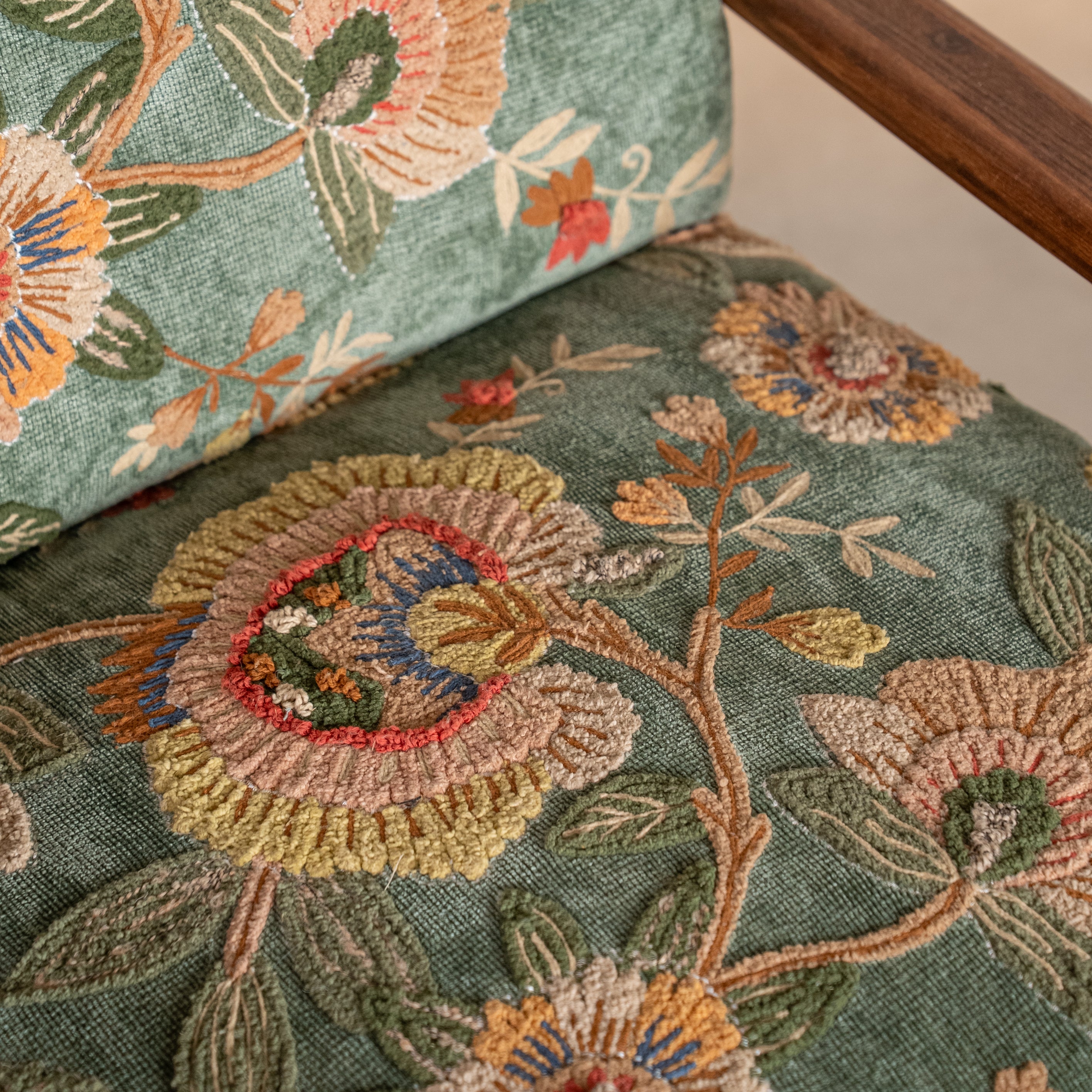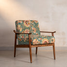 Vibrant blossoms in fiery oranges, sunset yellows, and coral reds dance across a lush teal-green canvas, echoing the iconic Gulmohar tree that transforms Indian landscapes each season. This is maximalism with soul—bold, unapologetic, alive.The luxuriously soft cotton upholstery beckons you into its embrace, while the warm, sculptural Oak wood frame provides grounding strength. Gulmohar doesn't whisper—it announces. It's for spaces that celebrate life, color, and the fearless spirit of those who inhabit them.