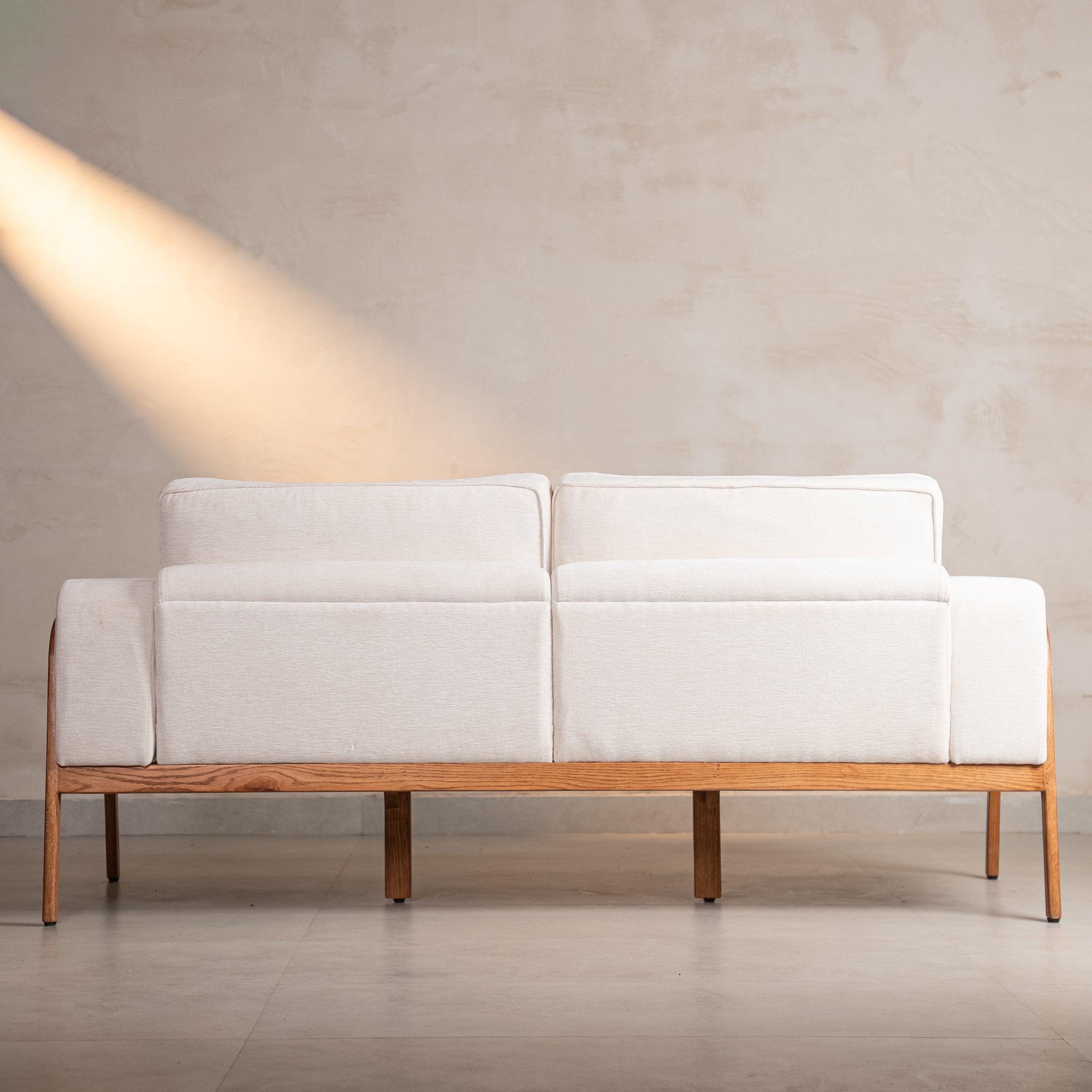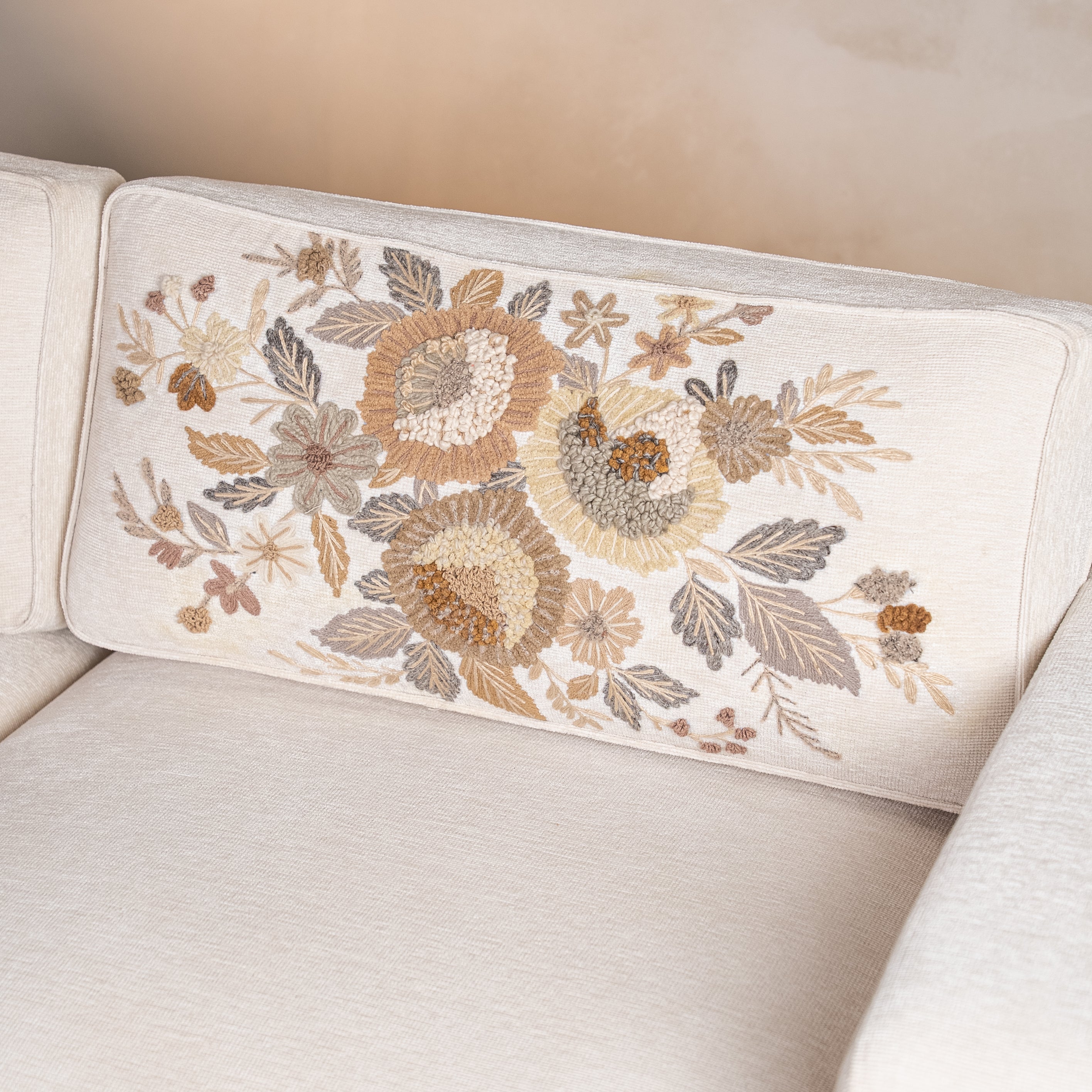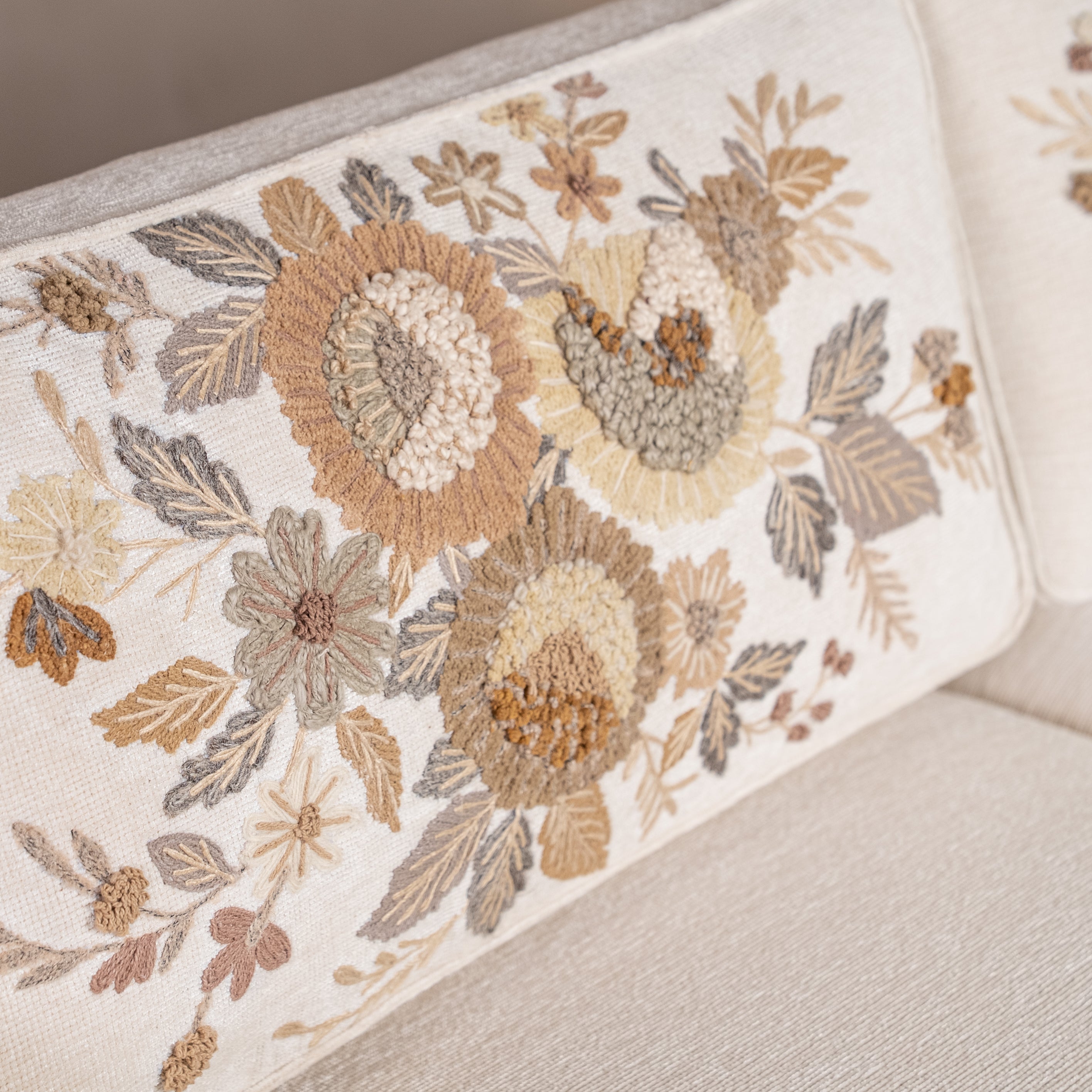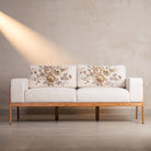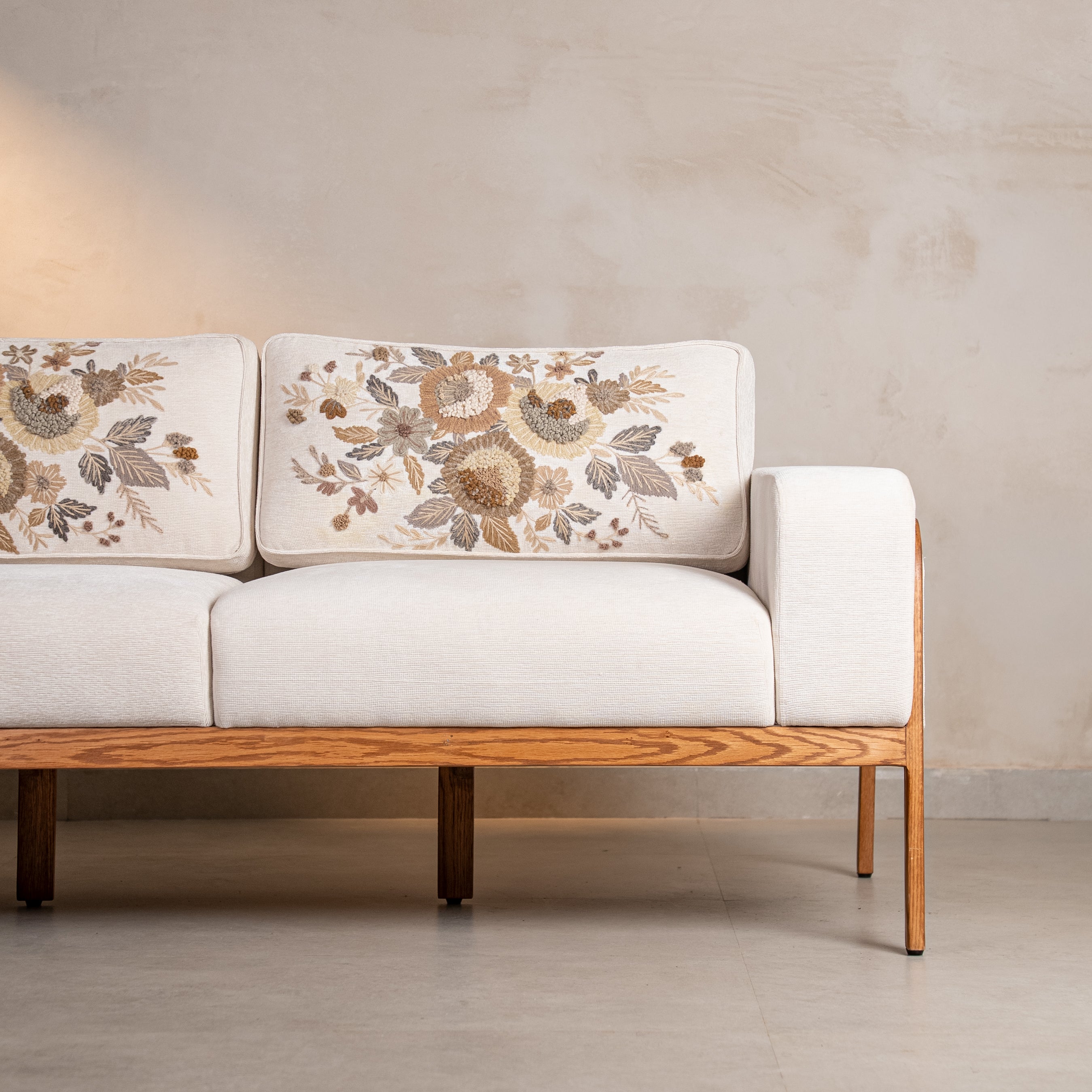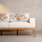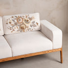 Where minimalism meets maximalist craft. The silhouette is clean—low oak frame, plush ivory cushions, contemporary lines. But look closer: hand-embroidered florals in muted golds and greys bloom across the back, each stitch placed with intention.This is the sofa that anchors your living room without overwhelming it. Perfect for long conversations, lazy Sunday afternoons, or simply making your space feel complete. Rumi doesn't shout—it stays.