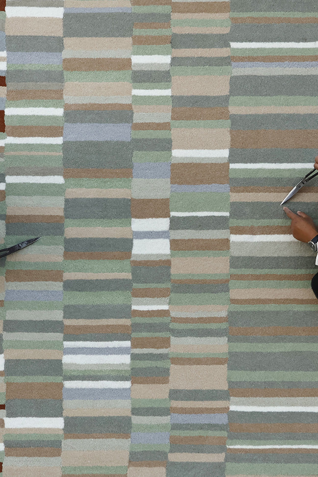 Fade features a rhythmic grid of rectangular forms that transition from light neutrals to deep rust tones. The subtle ombré effect adds depth, while the structured geometry keeps the design clean and architectural.