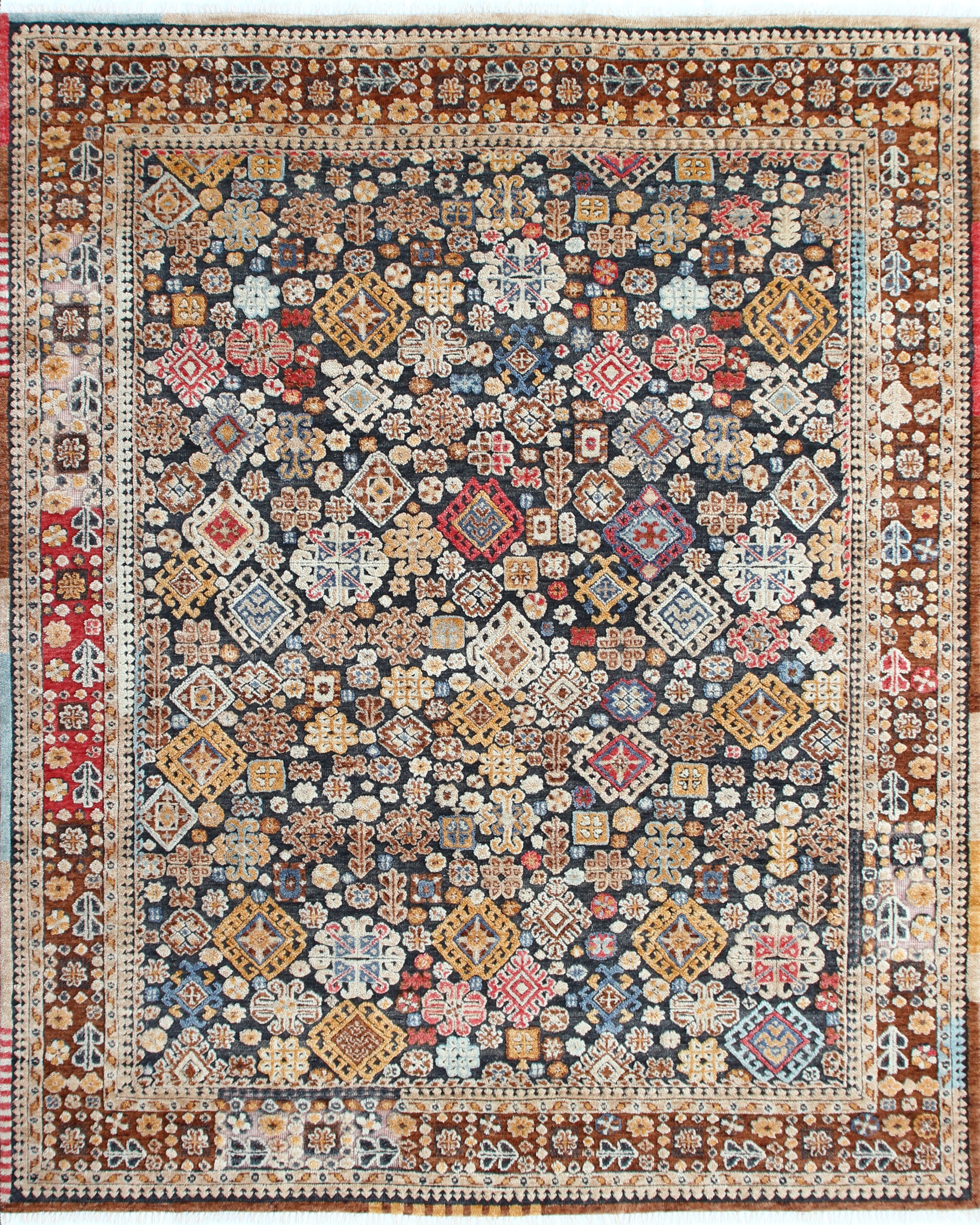 This Persian-style carpet, with its rich colours and rustic designs, will take you back in time. Hand-knotted with precision, this rug defines elegance.
